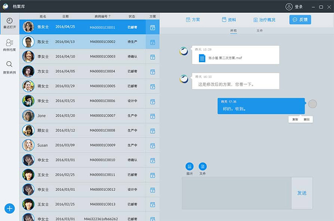 在模型、方案、照片等资料的传输均在秒级,聊天消息实时传输。快速的信息传送极大地提高了临床医生的工作效率,让临床医生为患者提供更多的服务。