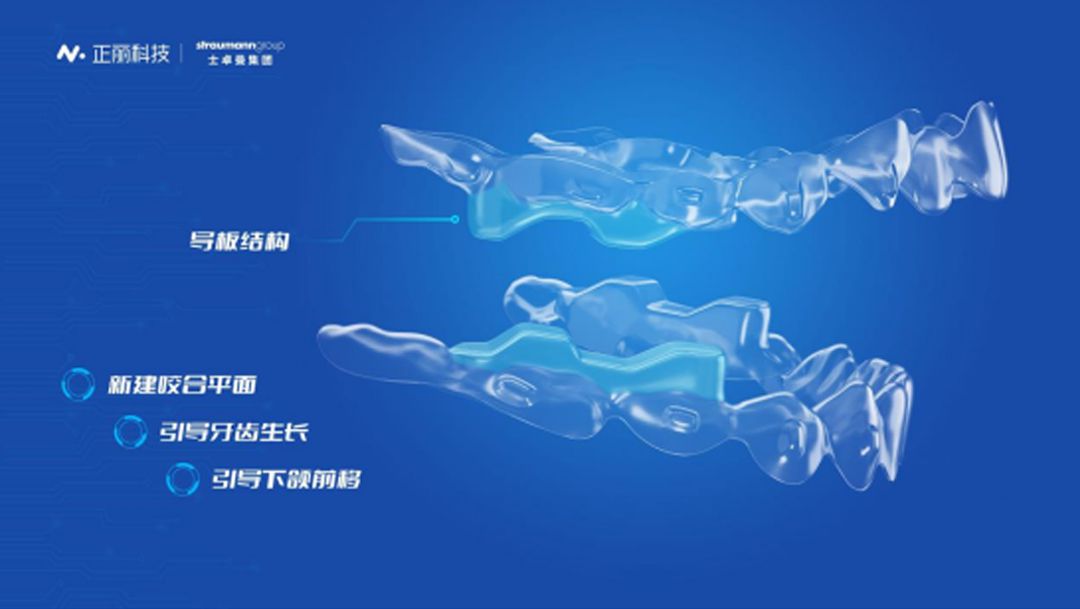现如今,双方再次合作推出青少年版产品——针对青少年最常见的正畸问题——下颌后缩,潜心研发出拥有特殊导板结构的功能矫治器,建立新的目标咬合平面,帮助打开咬合;在后牙区的上下颌牙齿处设置空泡,引导牙齿自然生长;通过上下颌矫治器上凹凸形特殊结构的适度错位设计,引导下颌前移。以上三步协同作用,在缩短矫治周期的同时,确保矫治更安全、高效。