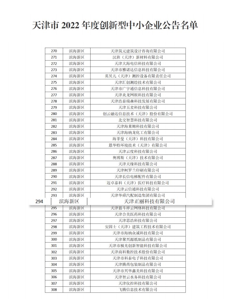 天津正丽科技有限公司(以下简称正丽科技)经过层层筛选,荣登榜单!创新型中小企业是指具有较高专业化水平、较强创新能力和发展潜力,是优质中小企业的基础力量、企业创新能力的“认证”标志。