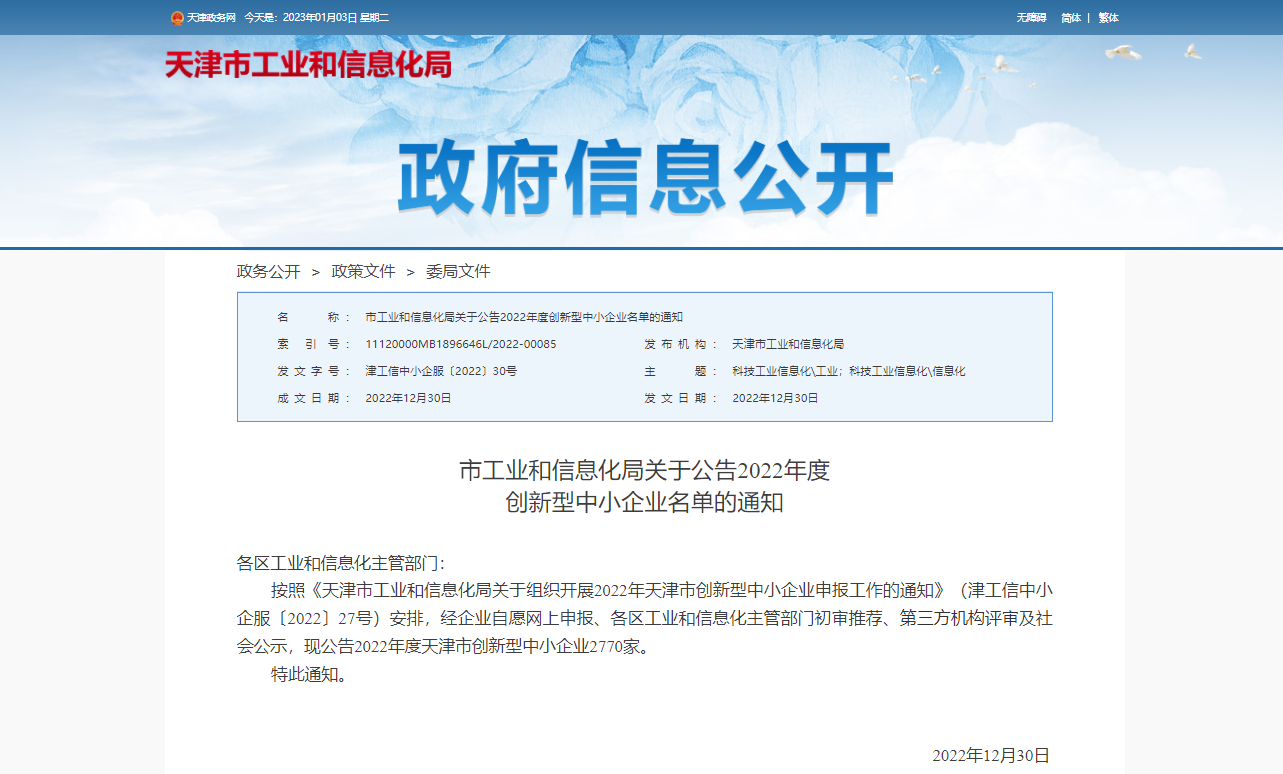 近日,天津市工业和信息化局发布关于“2022年创新型中小企业”认定名单。由部委领导、第三方机构评审及社会公开征集、资质审核等程序,最终于本月完成2022年创新型中小企业推荐名单公示。
